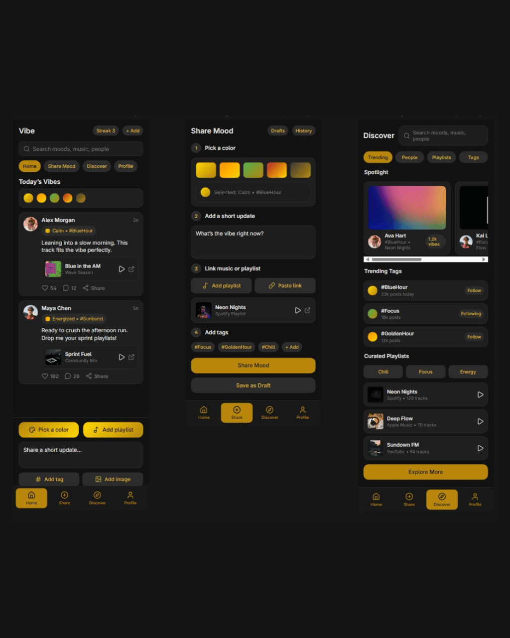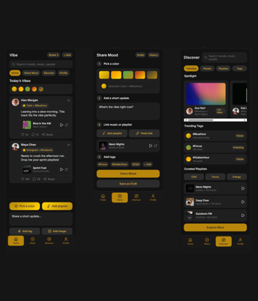 A lifestyle & social experience app that connects people through shared moods, music, and daily vibes. Users can share their feelings with colors, playlists, and short updates, making it a mix of journaling + social connection.