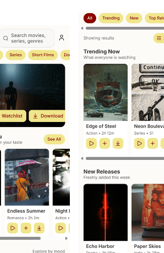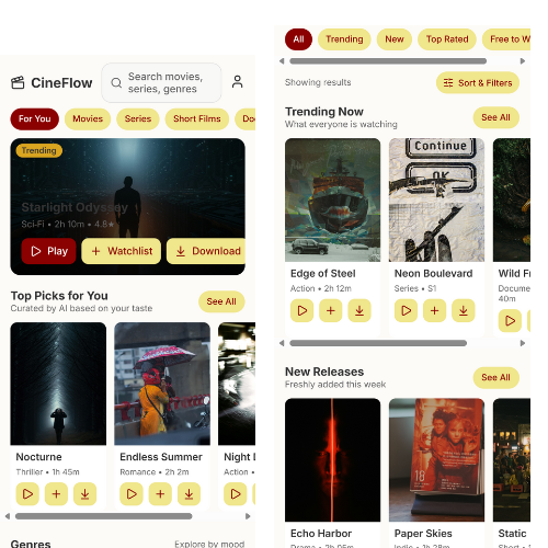 CineFlow is a modern entertainment app designed to bring movies, series, short films, and dramas together in one seamless streaming experience. The interface features a sleek dark theme with vibrant accent colors for a cinematic vibe. Users can easily browse trending titles, personalized recommendations, and genre-based collections.