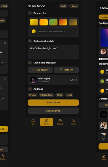 A lifestyle & social experience app that connects people through shared moods, music, and daily vibes. Users can share their feelings with colors, playlists, and short updates, making it a mix of journaling + social connection.
